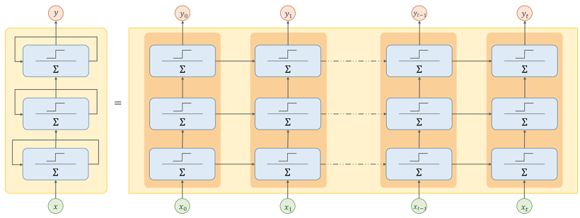- 초기 상태 \( h_{(hint)} \)를 0으로 설정하고 첫 번째 타임 스텝 \( x_{(0)} \)와 함께 하나의 순환 뉴런으로 전달