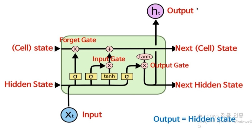 키포인트는 LSTM 네트워크에서 장기 상태로 저장할 값, 버릴 값, 읽어드릴 값을 학습하는 것입니다. 이전 장기 기억인 (Cell) state는 삭제 게이트를 지나서 일부 정보를 손실하고, 입력 게이트를 지나 선택된 정보들을 추가합니다. 이렇게 만들어진 새로운 장기 기억은 다음 장기 기억(Next Cell State)으로 전달됩니다. 그래서 각 타임 스텝 마다 일부 정보는 손실되고, 추가됩니다. 또한 이 새롭게 만들어진 장기 기억은 tanh 활성화 함수를 거쳐, 출력 게이트를 통과합니다. 이렇게 해서 만들어진 단기 상태가 Output(\(h_t\)) 값으로 전달됩니다.